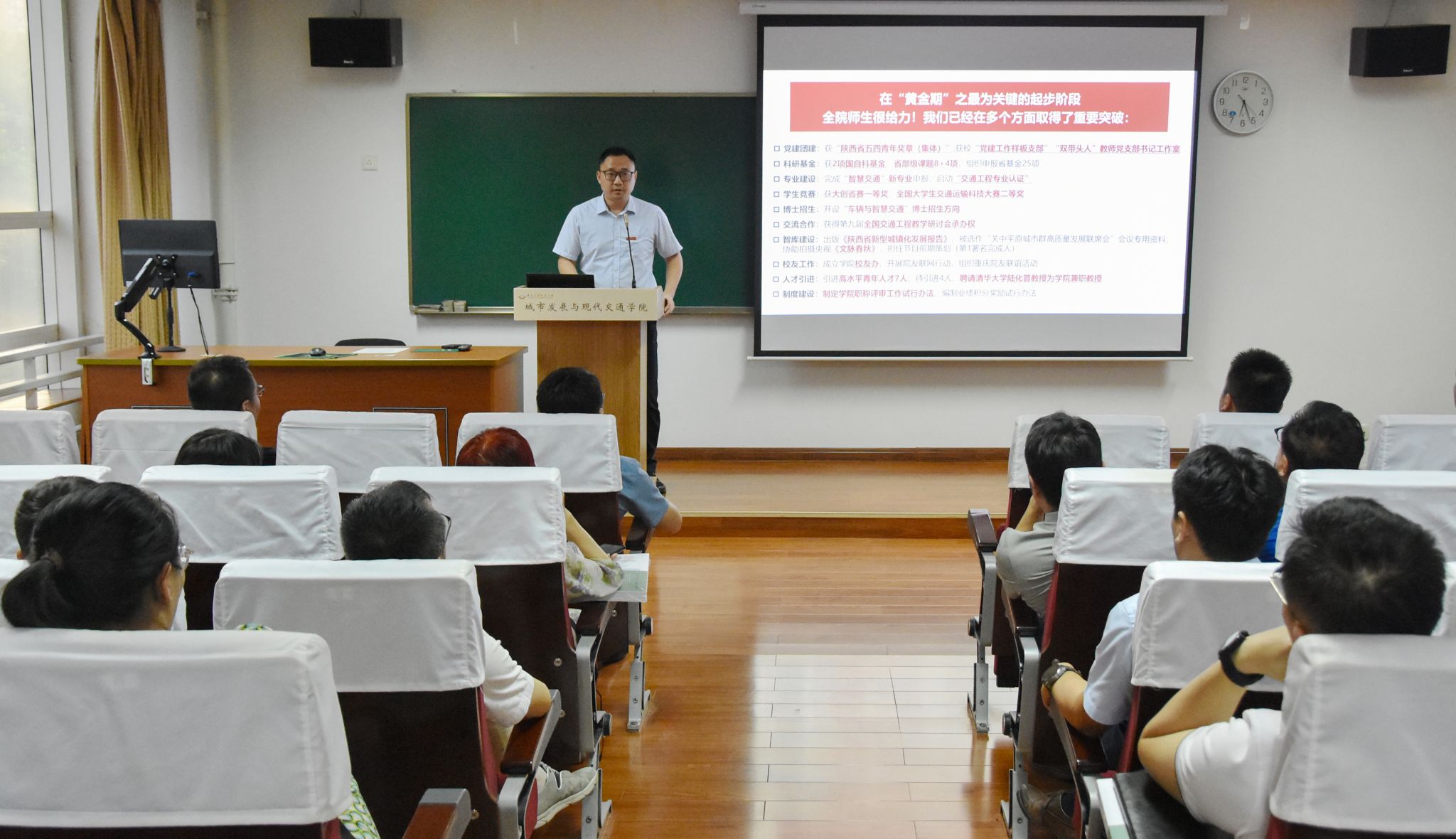 会上,学院党委书记夏进文传达了党委书记朱晓渭、校长赵祥模在学校暑期党政工研讨会上的讲话精神,向全体教职工详细报告了会议主要内容和具体要求,并按照会议精神对学院新学期重点工作进行指导。同时,他向全体教师提出三点要求:一要胸怀理想,坚持立德树人,秉持“学高为师,身正为范”精神,争做一名让学生崇敬的好老师。二要凝心聚力,紧紧围绕学科建设目标,奋起急追,打造高质量发展新引擎。三要抢抓机遇,瞄准前沿,在教学改革、科学研究、社会服务等方面寻找契机,创新发展。