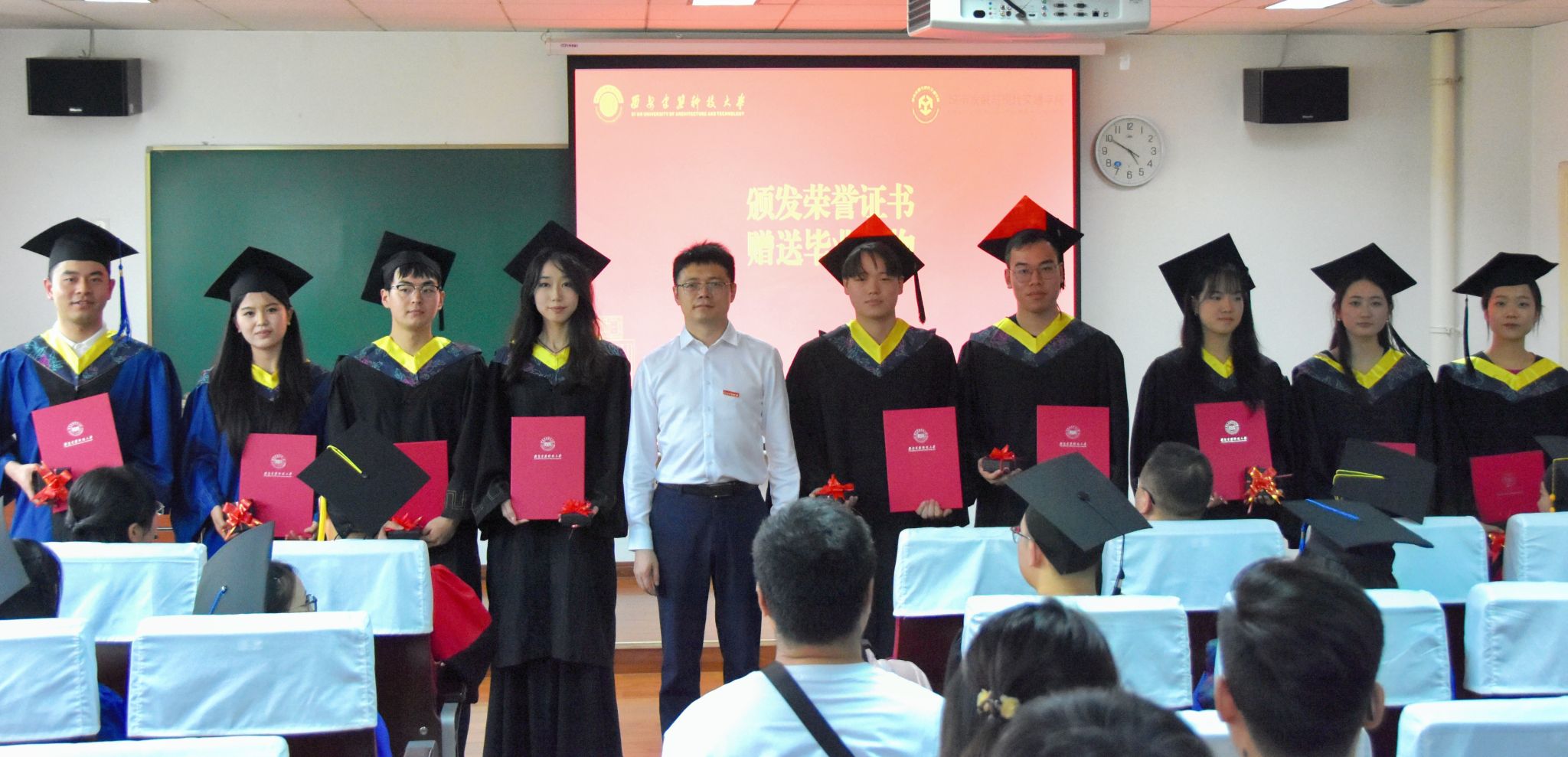 执行院长李小龙为毕业生授位,学位委员会成员李锐、陈君为毕业生拨穗。