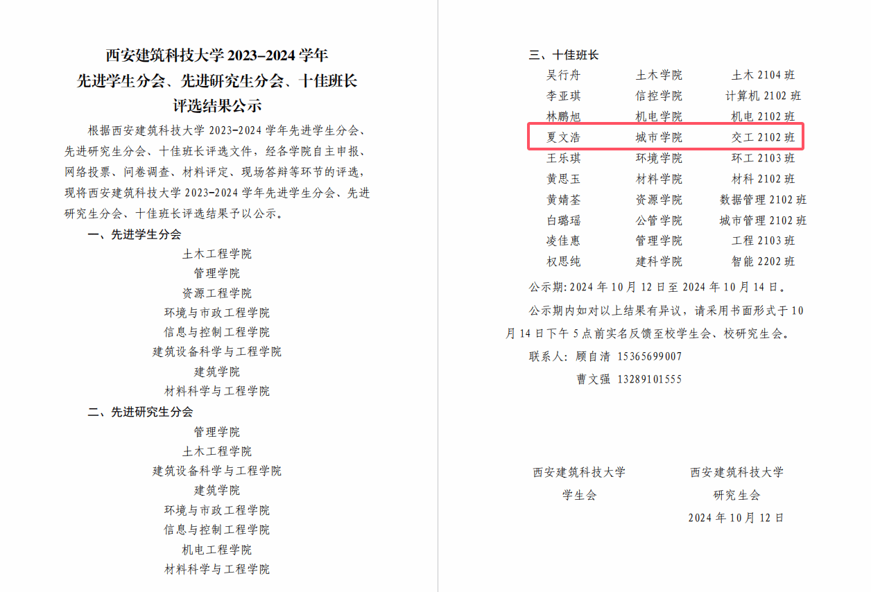 交工2102班班长夏文浩获评2023-2024学年“十佳班长”荣誉称号。