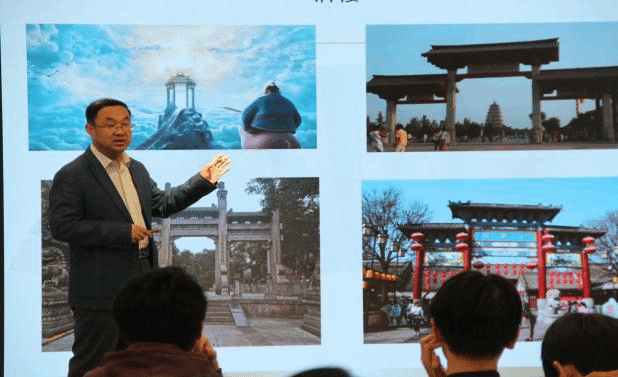 杨曙明表示,今年春节档电影《哪吒之魔童闹海》硬核出圈,其不仅在剧情与角色设计给人留下深刻印象,更是在情节和画面中蕴含了大量的文化元素,在文化传承与创新之间找到完美平衡。他从电影场景、道具、服饰等多角度展开,以天元鼎、结界兽、玉虚宫等影片细节设计切入,向师生生动展示了电影中埋藏的中华优秀传统文化元素。