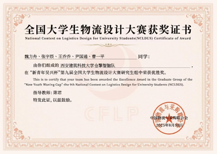 陈君老师指导,魏方舟、张宇宸、王乔乔、尹国童、曹一平五位研究生组成的“仓擎智脑”团队荣获优胜奖。